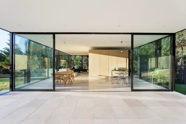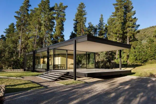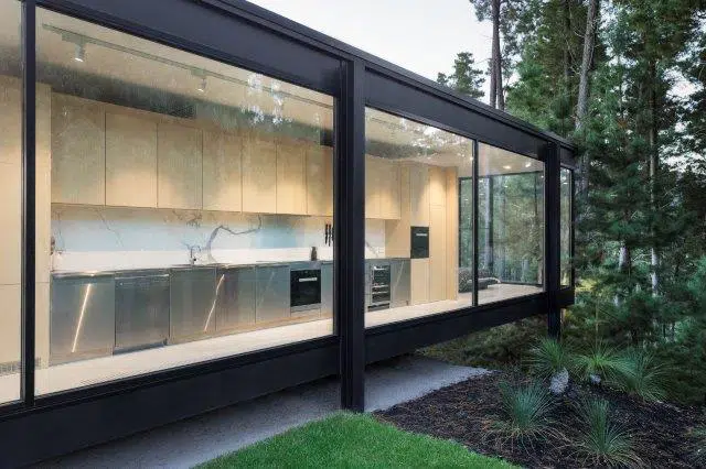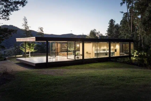 This stunning, ultra-modern home, located at the base of the Howqua Hills, was thoughtfully designed to capitalize on the breathtaking views of Lake Eildon National Park and nearby lakes. Full-height double-glazed windows wrap around the building, offering an almost seamless panoramic view of the surroundings while optimizing thermal performance. Elevated above the rocky landscape, the structure is supported by only eight minimal supports, allowing for maximum airflow and energy efficiency.